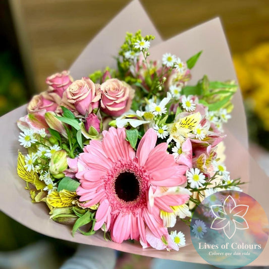 Ramo mix Floral, con toques de Astromelias, mini rosas, y diversas flores de la estacion. Acompañadas de toques de follaje y flores silvestres