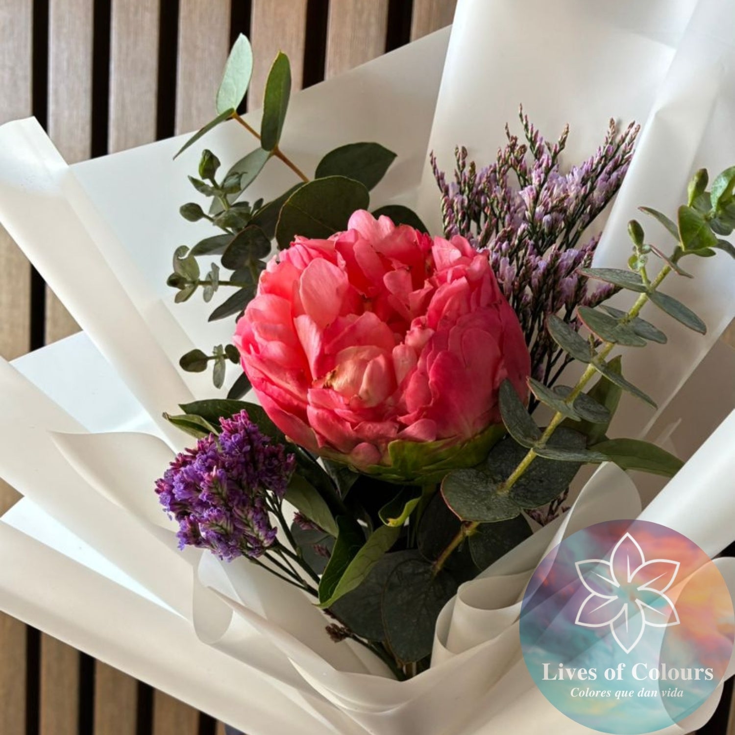 Hermoso ramo de una peonia decorado con limonio fresco y eucalipto